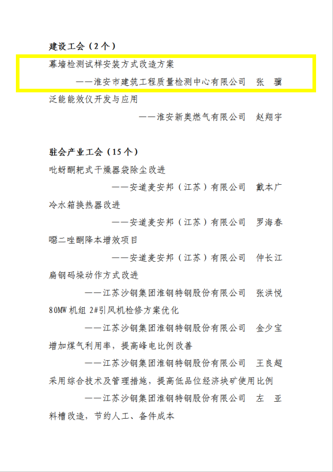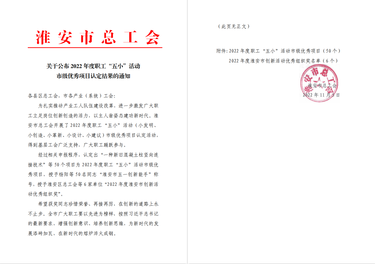 為扎實(shí)推動(dòng)產(chǎn)業(yè)工人隊(duì)伍建設(shè)改革,激發(fā)廣大職工立足崗位創(chuàng)新創(chuàng)造的活力,提升產(chǎn)業(yè)工人技能水平?;窗彩锌偣?huì)在全市開展2022年“五小”活動(dòng)典型案例評(píng)選活動(dòng),檢測(cè)中心節(jié)能所提交的《幕墻檢測(cè)試樣安裝方式改造方案》項(xiàng)目被列入2022年度職工“五小”活動(dòng)市級(jí)優(yōu)秀項(xiàng)目,張?bào)K同志被淮安市總工會(huì)授予“淮安市五一創(chuàng)新能手”稱號(hào)。