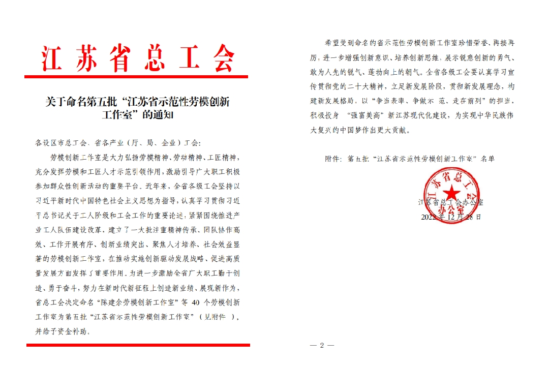 “江蘇省示范性勞模創(chuàng)新工作室”
