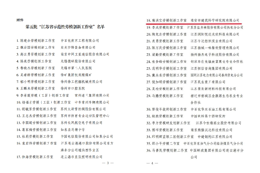 2022年12月28日,江蘇省總工會對第五批“江蘇省示范性勞模創(chuàng)新工作室”進行了命名表彰,淮安市建筑科學(xué)研究院雍洪寶勞模創(chuàng)新工作室榜上有名。