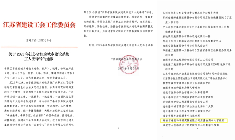 近日,江蘇省建設(shè)工會工作委員會印發(fā)了《關(guān)于2023年江蘇省住房城鄉(xiāng)建設(shè)系統(tǒng)工人先鋒號的通報》,淮安建科院所屬檢測中心節(jié)能所榮獲“2023年江蘇省住房和城鄉(xiāng)建設(shè)系統(tǒng)工人先鋒號”。